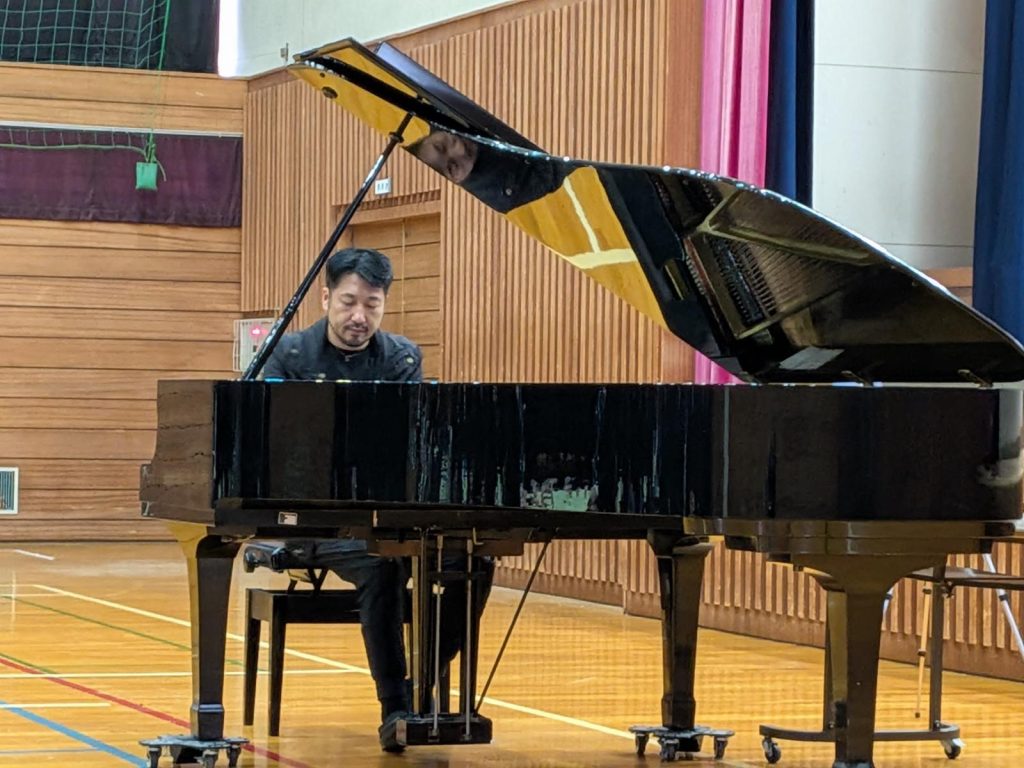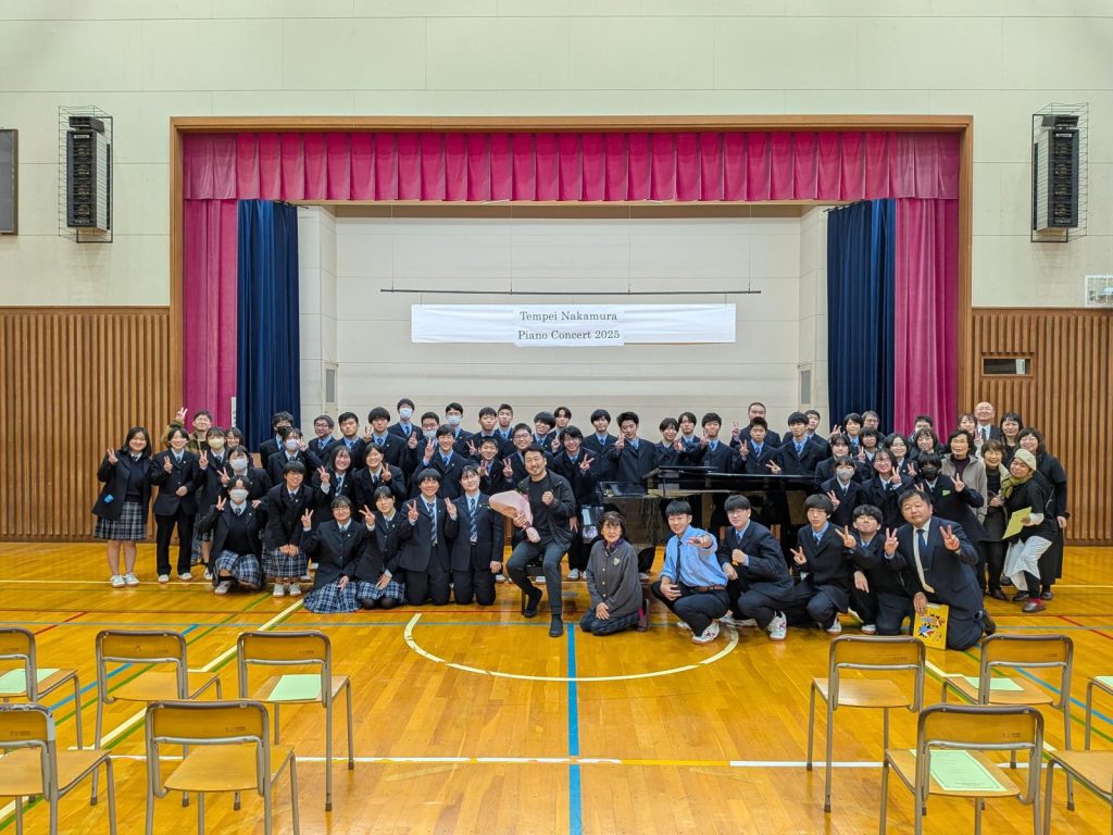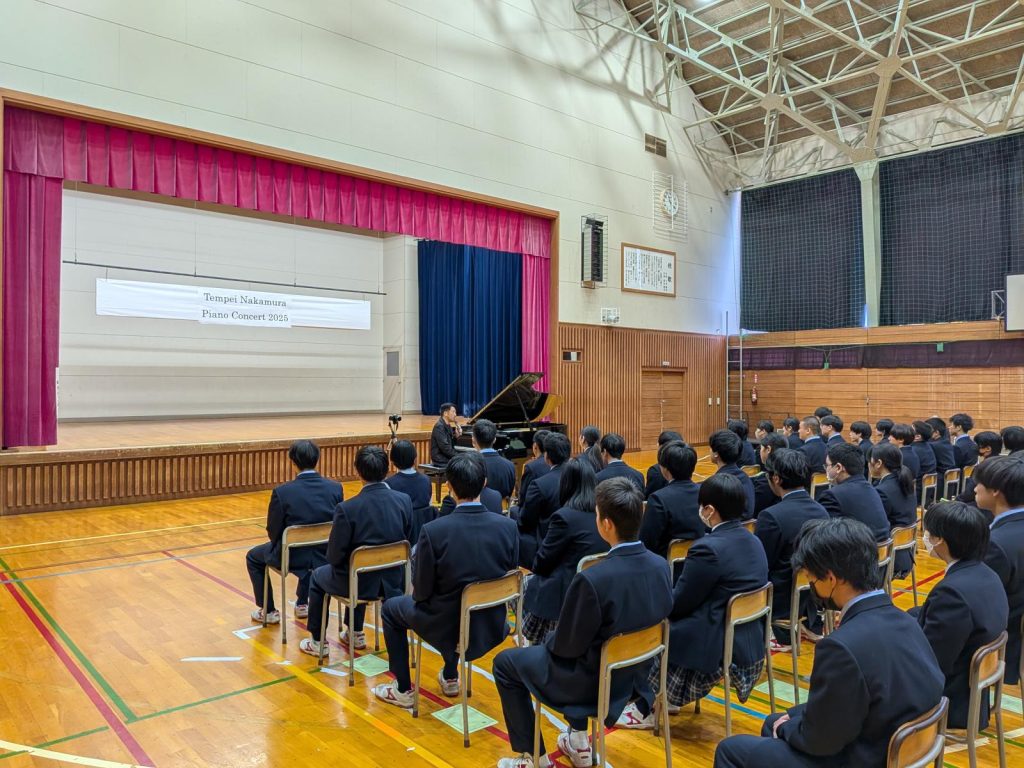 11月11日(火)本校体育館で、世界的に活躍するピアニスト・中村天平さんによるピアノコンサートが行われました。会場には本校生徒をはじめ、多くの保護者・地域の方々が訪れ、約1時間にわたり情熱的で繊細な演奏に耳を傾けました。