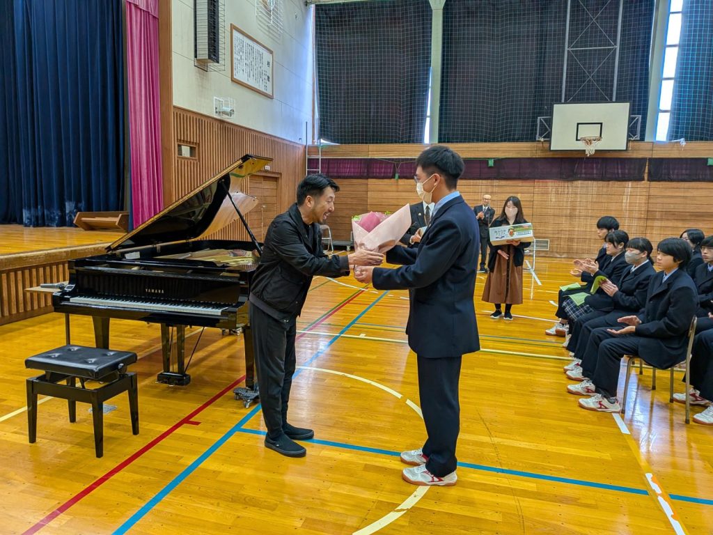 中村天平さんは、独創的な作曲と力強くも優しいタッチで知られるピアニストです。今回の公演は、俳優・高倉健さんの命日(11月10日)に合わせて、例年ログホテル「ラーチ」で実施されていたもので、ラーチの閉館に伴い会場を模索されていた幾寅婦人会から、「高校の体育館でできないだろうか」と打診がありました。高校も芸術鑑賞の機会と捉え、さらに中村天平さんの快諾により、三者の思いが一つとなって開催する運びとなりました。