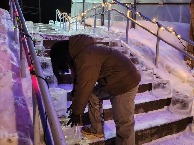 アイスキャンドルは、水を容器に入れ、凍らせ、水抜きして作られます。今回、作製段階から携わらせていただき、容器の水が全て凍ってしまうと中心部を空洞にできず、逆に凍り方が甘いとバケツから取り出すときに割れてしまうなど、経験が必要な難しい作業だということを知りました。また、日中気温が高くなり、各事業所で制作したアイスキャンドルが溶けてしまうトラブルがありましたが、地域の方々の連携により、当日の昼には約800個のアイスキャンドルが完成しました。
