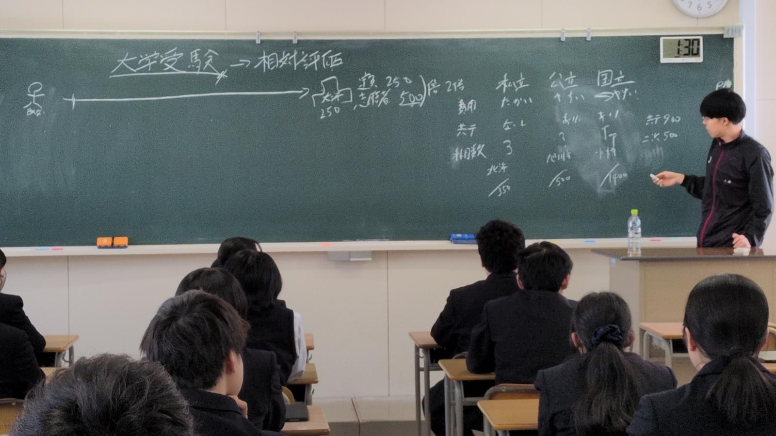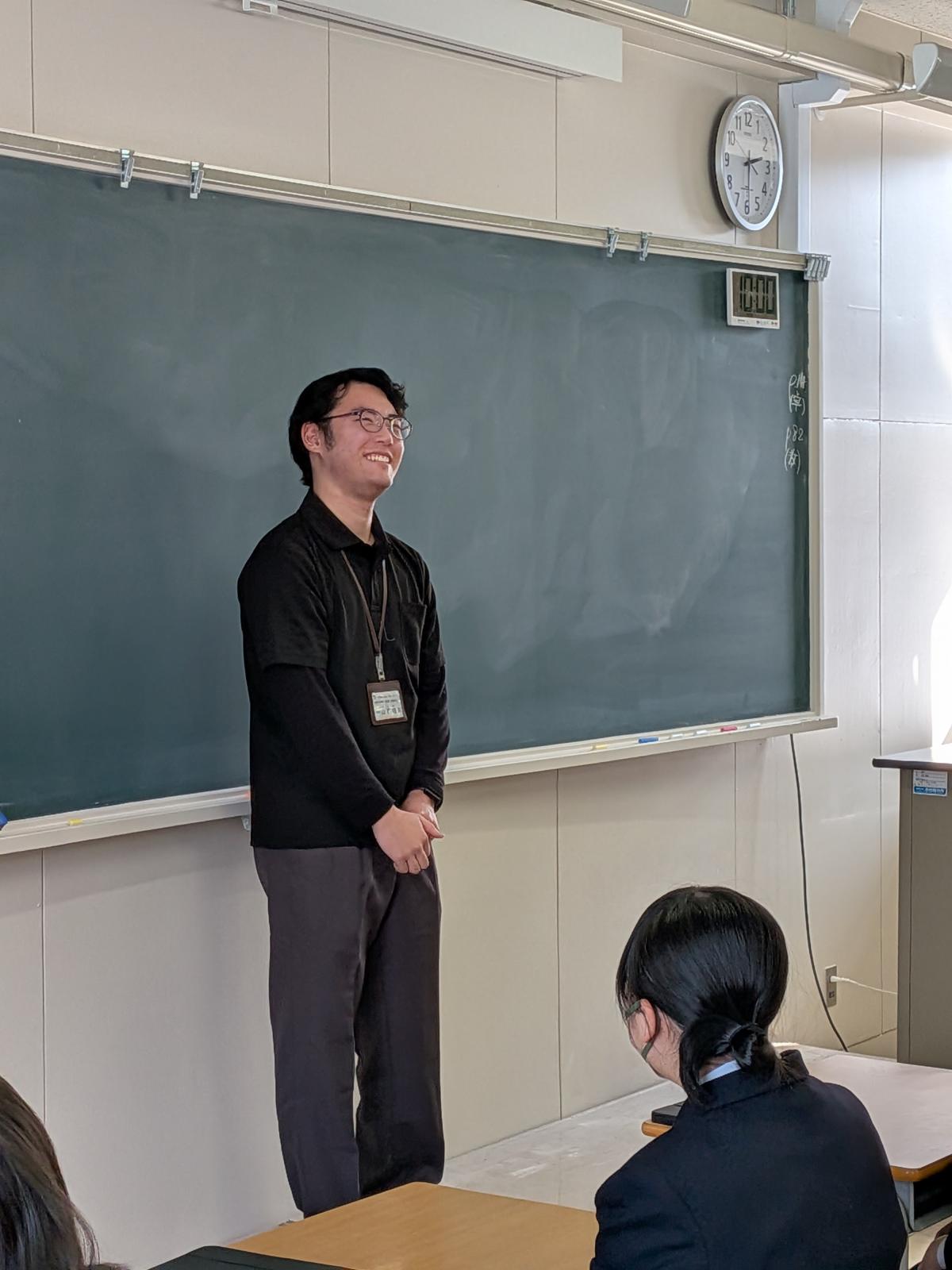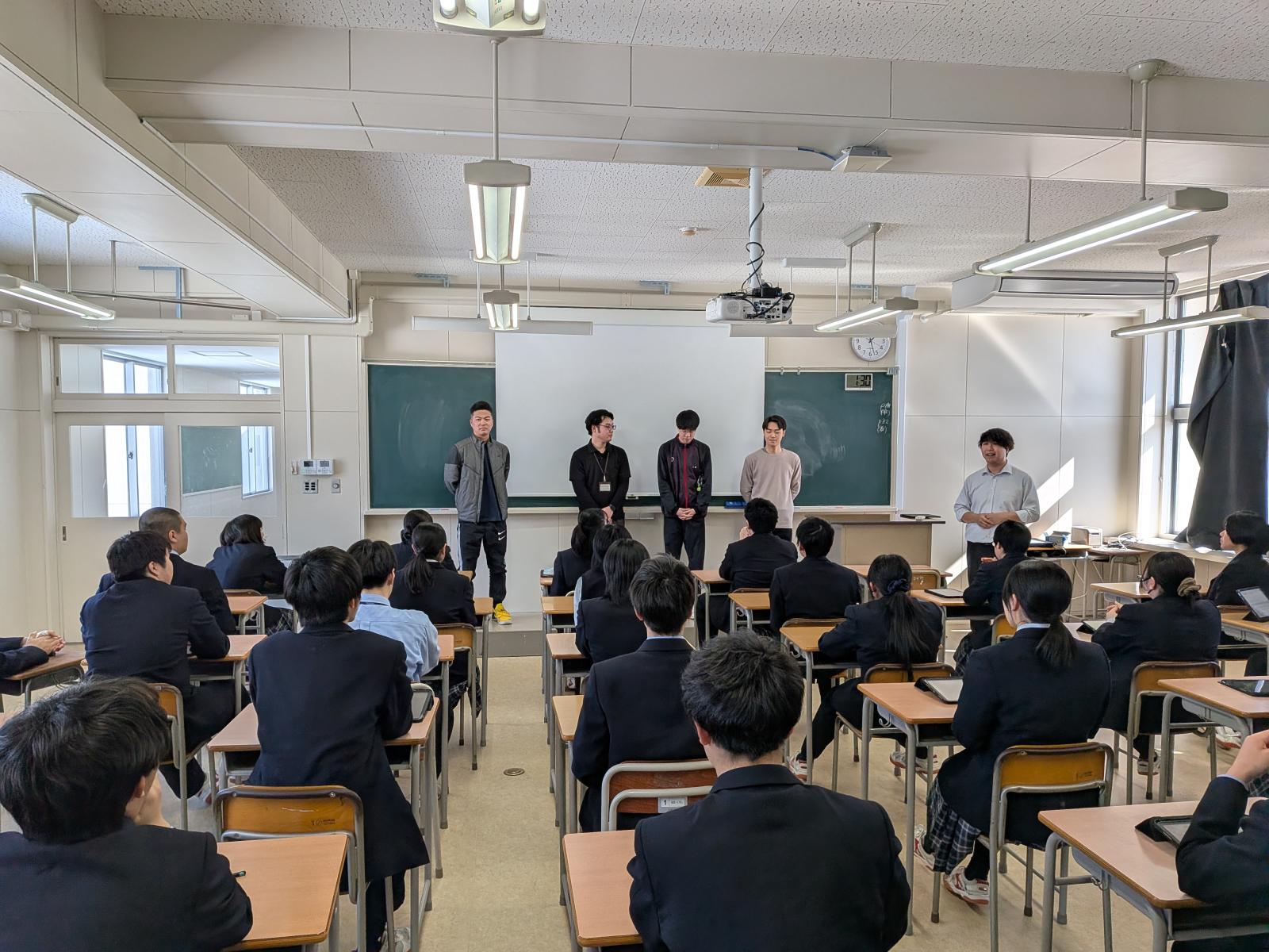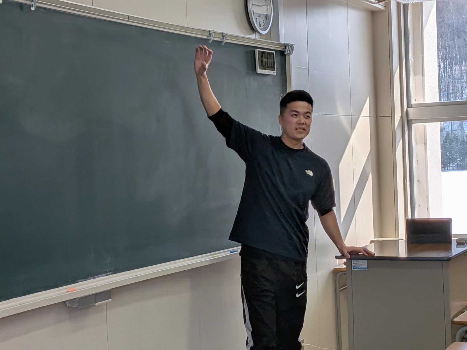 当日は、講師として今年卒業した秋田駿也さん(就職)、三浦雅史さん(進学)をお招きするとともに、特別講師として本校卒業生で現在南富良野町役場に勤務されている山西瞳翔さん(令和5年度卒)、また、あしなが整骨院院長の安西孝典さん(平成25年度卒)にもご来校いただきました。